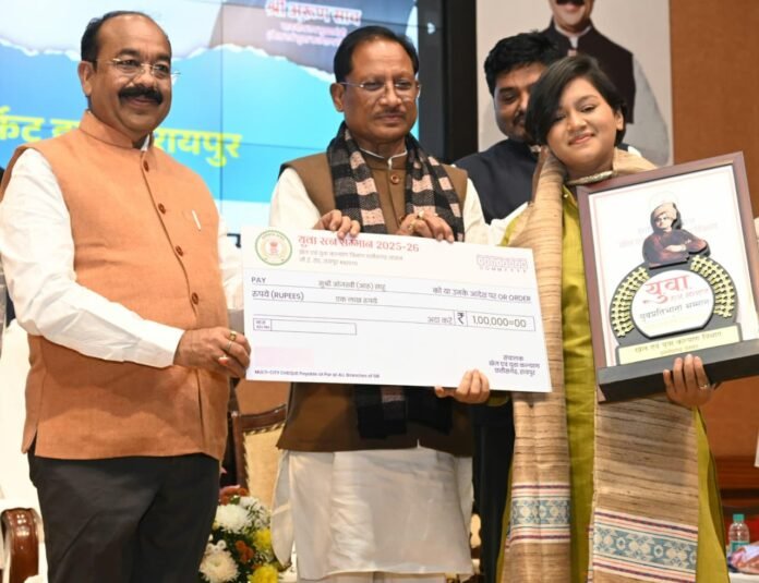 रायपुर. 12 जनवरी 2026. मुख्यमंत्री श्री विष्णु देव साय ने विभिन्न क्षेत्रों में उत्कृष्ट कार्य करने वाले राज्य के आठ युवाओं तथा धमतरी जिले के युवा स्टार सेवा समिति खुरतुली को आज राष्ट्रीय युवा दिवस पर सम्मानित किया। उन्होंने खेल एवं युवा कल्याण विभाग द्वारा आज रायपुर के नवीन विश्राम भवन में आयोजित युवा रत्न सम्मान समारोह में सामाजिक, सांस्कृतिक, साहित्यिक, शैक्षणिक, खेल एवं अन्य क्षेत्रों में उत्कृष्ट प्रदर्शन करने वाले युवाओं को छत्तीसगढ़ युवा रत्न सम्मान प्रदान किया।