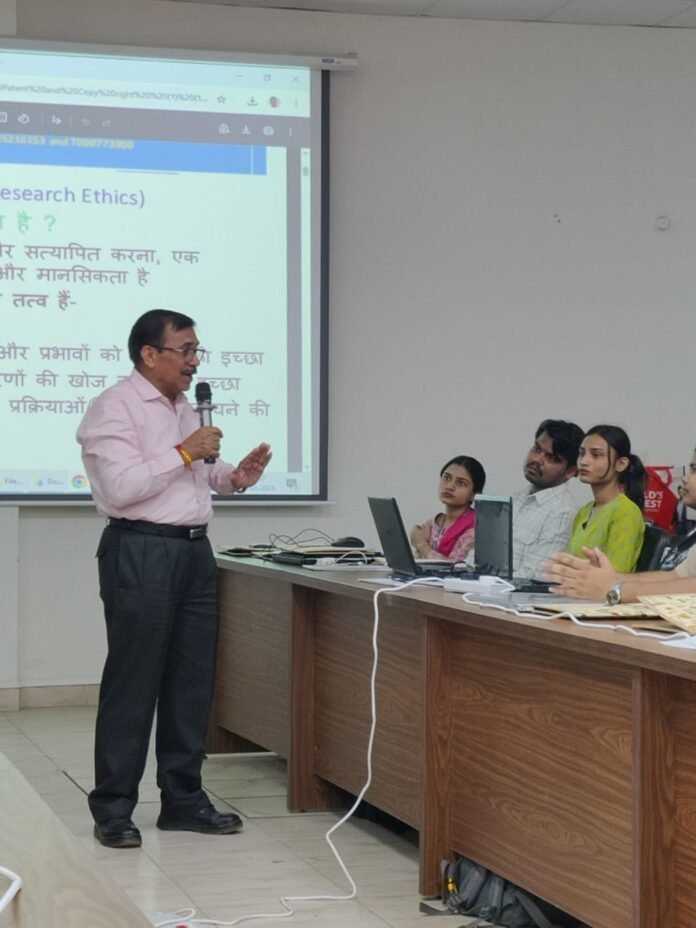 उद्घाटन सत्र के पश्चात प्रथम तकनीकी सत्र का आयोजन किया गया। इस सत्र के मुख्य वक्ता डॉ. तपेश चंद्र गुप्ता रहे। उन्होंने “रिसर्च एथिक्स” विषय पर विस्तार से जानकारी देते हुए शोध की अवधारणा, नैतिकता, पारदर्शिता बनाए रखने की आवश्यकता और अनुसंधान में जिम्मेदारियों पर प्रकाश डाला। उन्होंने ’’आईपीआर, पेटेंट, कॉपीराइट, ट्रेडमार्क, इंडेक्सिंग और प्लेगरिज्म’’ जैसे महत्वपूर्ण पहलुओं के बारे में भी विस्तार से बताया। साथ ही उन्होंने शोध विषय के चयन, शोध पत्र लेखन की प्रक्रिया तथा शोध में ’’कंप्यूटर और आर्टिफिशियल इंटेलिजेंस’’ की भूमिका पर भी शोधार्थियों को मार्गदर्शन दिया और बताया कि आधुनिक शोध में तकनीकी उपकरणों का सही उपयोग शोध की गुणवत्ता और प्रभाव को बढ़ा सकता है। डॉ. गुप्ता ने शोधार्थियों को सलाह दी कि वे अपने शोध पत्रों को लिखते समय वैज्ञानिक प्रमाणों, संदर्भों और नैतिक मानकों का पालन करें। उन्होंने शोध में ’’आईपीआर, पेटेंट, कॉपीराइट, ट्रेडमार्क, इंडेक्सिंग और प्लेगरिज्म’’ जैसे महत्वपूर्ण विषयों पर विस्तृत जानकारी दी। उन्होंने कहा कि शोध का उद्देश्य केवल प्रकाशन नहीं बल्कि समाज और विज्ञान के लिए मूल्यवान योगदान देना होना चाहिए।