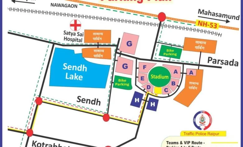 दुर्ग–भिलाई की ओर से आने वाले दर्शकों के लिए मार्ग व्यवस्था : दुर्ग–भिलाई की ओर से आने वाले दर्शक टाटीबंध से रिंग रोड नंबर-01 होकर पचपेढ़ीनाका, तेलीबांधा थाना तिराहा, नेशनल हाईवे क्रमांक-53 होकर सेरीखेड़ी ओवरब्रिज से नया रायपुर मार्ग होकर स्टेडियम तिराहा से साईं अस्पताल रोड होकर साईं अस्पताल पार्किंग व सेंध तालाब पार्किंग में अपना वाहन पार्क कर स्टेडियम पैदल पहुंचेंगे।