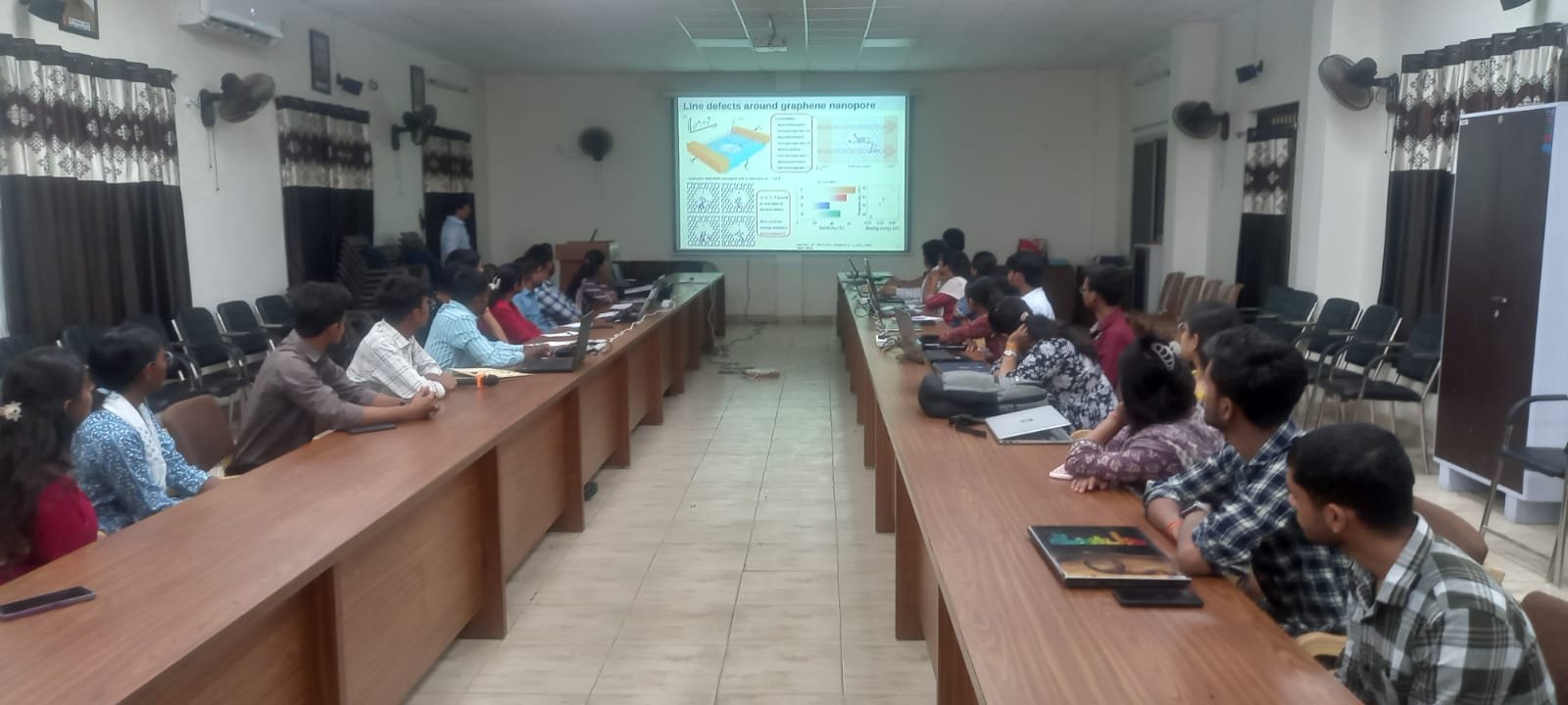 दिन का पहला तकनीकी सत्र ’’डॉ. बी. केशव राव, श्री शंकराचार्य तकनीकी परिसर, भिलाई’’ द्वारा संचालित किया गया। इस सत्र में उन्होंने ’’ग्राफीन में रेखीय दोषों का महत्व और नैनो-सेंसर प्रदर्शन पर उनका प्रभाव’’ समझाया। उन्होंने बताया कि कैसे ’’ग्रेन सीमाएँ और विस्तारित विस्थापन’’ विद्युत चालकता, पदार्थ की अवशोषण क्षमता और यांत्रिक स्थिरता को प्रभावित करते हैं। प्रतिभागियों को यह स्पष्ट रूप से समझ में आया कि संरचनात्मक दोषों का सही तरीके से उपयोग करके नैनो-सेंसर के प्रदर्शन को बेहतर बनाया जा सकता है। दिन का दूसरा तकनीकी सत्र भी ’’डॉ. बी. केशव राव’’ द्वारा संचालित किया गया, जिसमें उन्होंने ’’दोष प्रबंधन में व्यावहारिक रणनीतियों’’ पर प्रकाश डाला ताकि ग्राफीन आधारित सेंसर की संवेदनशीलता बढ़ाई जा सके। इस सत्र में प्रतिभागियों ने सक्रिय रूप से भाग लिया और ’’सिंथेसिस और सिमुलेशन तकनीकों के वास्तविक अनुसंधान परियोजनाओं में उपयोग’’ के बारे में प्रश्न पूछे। तकनीकी सत्रों के बाद ’’व्यावहारिक प्रशिक्षण सत्र’’ आयोजित किया गया। इसमें संकाय सदस्य और शोध छात्र ’’लिनक्स वातावरण’’ में कार्य करते हुए ’’सांद्रता आधारित सैद्धांतिक विश्लेषण’’ और मॉडलिंग अभ्यास कर रहे थे। डॉ. राव ने दिखाया कि कैसे ’’2डी सामग्री की ज्यामितीय संरचना को परिभाषित किया जाता है, लैटिस मानों को अनुकूलित किया जाता है’’, और ’’सांद्रता और आंशिक सांद्रता डेटा तैयार किए जाते हैं।’’ प्रतिभागियों ने ’’ग्राफ तैयार करना और उनका विश्लेषण करना’’ सीखा, जिससे उन्हें नैनोमटेरियल अनुसंधान में व्यावहारिक अनुभव प्राप्त हुआ।