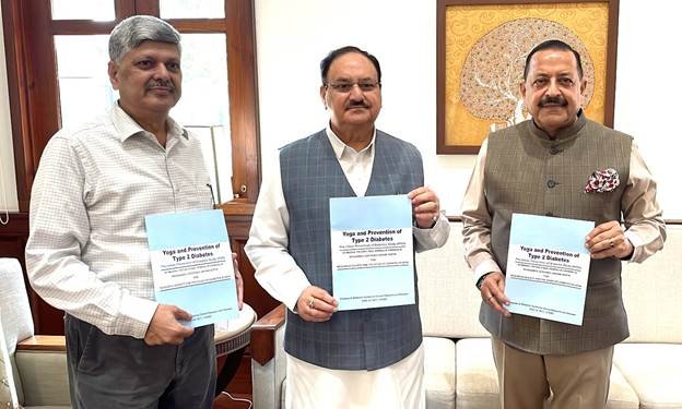 दिल्ली। विज्ञान और प्रौद्योगिकी मंत्री डॉ. जितेंद्र सिंह ने स्वास्थ्य और परिवार कल्याण मंत्री जे.पी. नड्डा को ‘योग और टाइप 2 मधुमेह की रोकथाम’ पर एक नई रिपोर्ट प्रस्तुत की। डॉ. जितेंद्र सिंह खुद एक प्रसिद्ध मधुमेह विशेषज्ञ हैं। रिपोर्ट के अनुसार अध्ययन से पता चलता है कि योग के नियमित अभ्यास से टाइप 2 मधुमेह के प्रति संवेदनशील व्यक्तियों में इसके खतरे को 40 प्रतिशत तक कम किया जा सकता है।